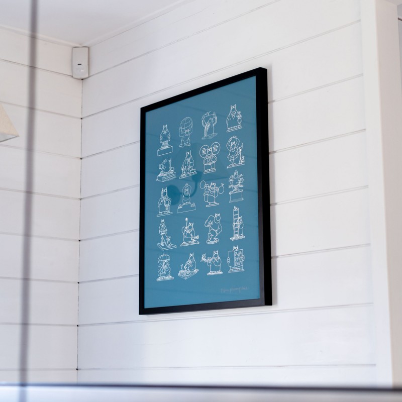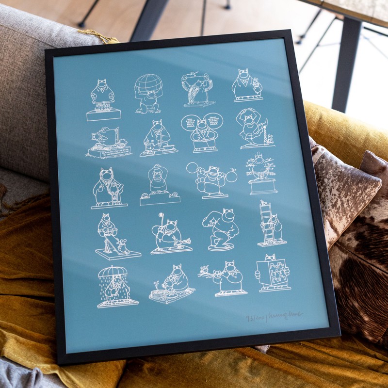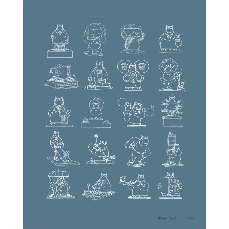 Sérigraphie artisanale présentant les 20 statues monumentales du Chat en bronze exposées lors de l'exposition à ciel ouvert du Chat déambule.